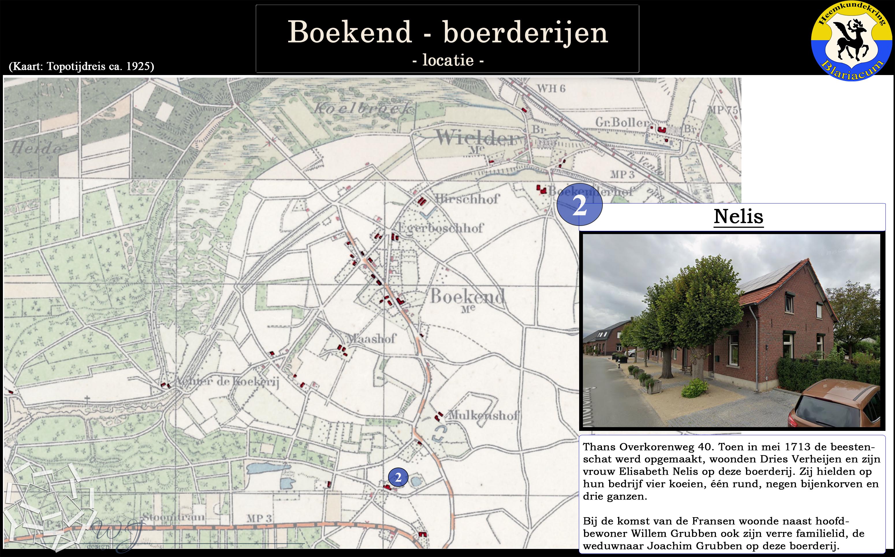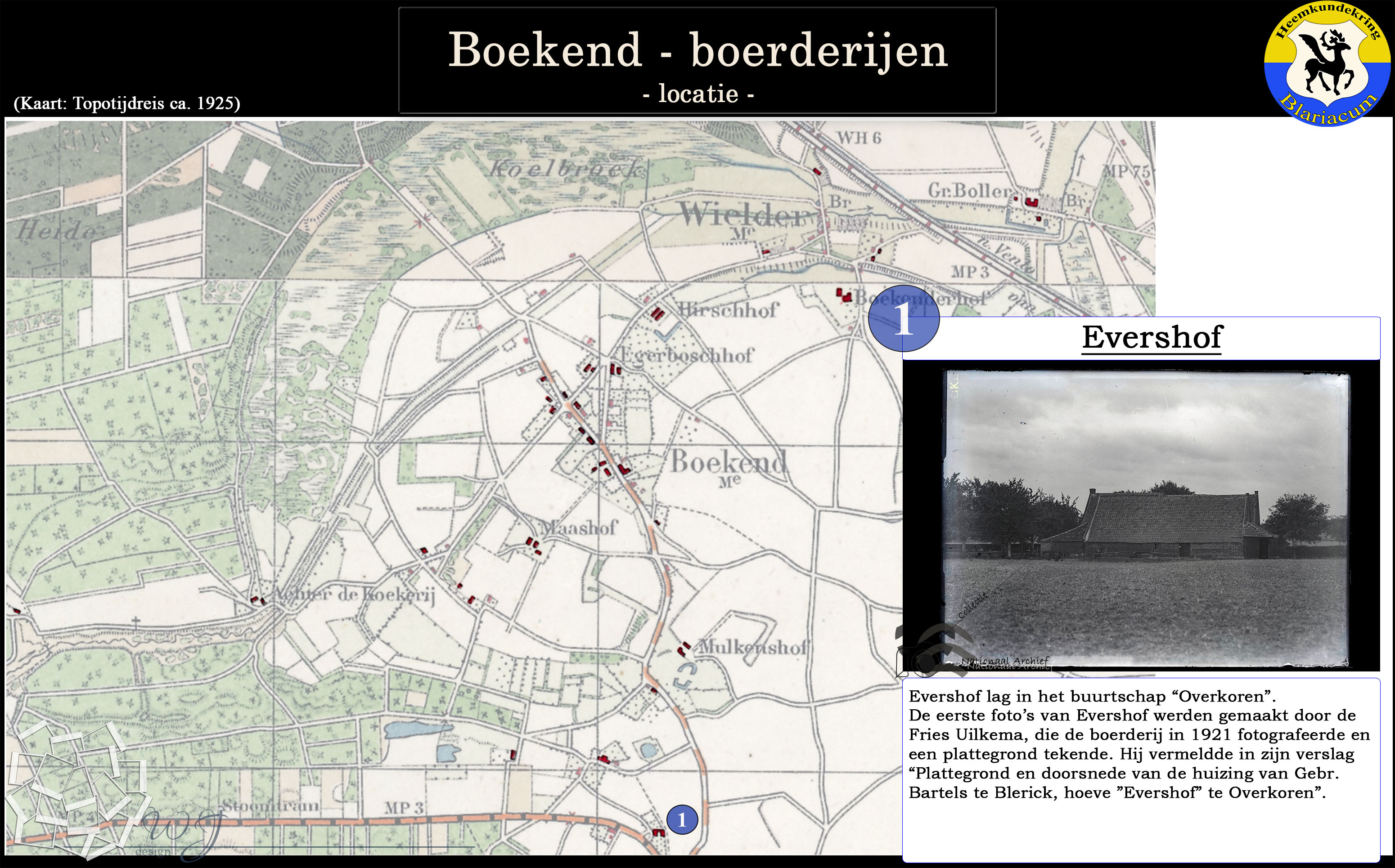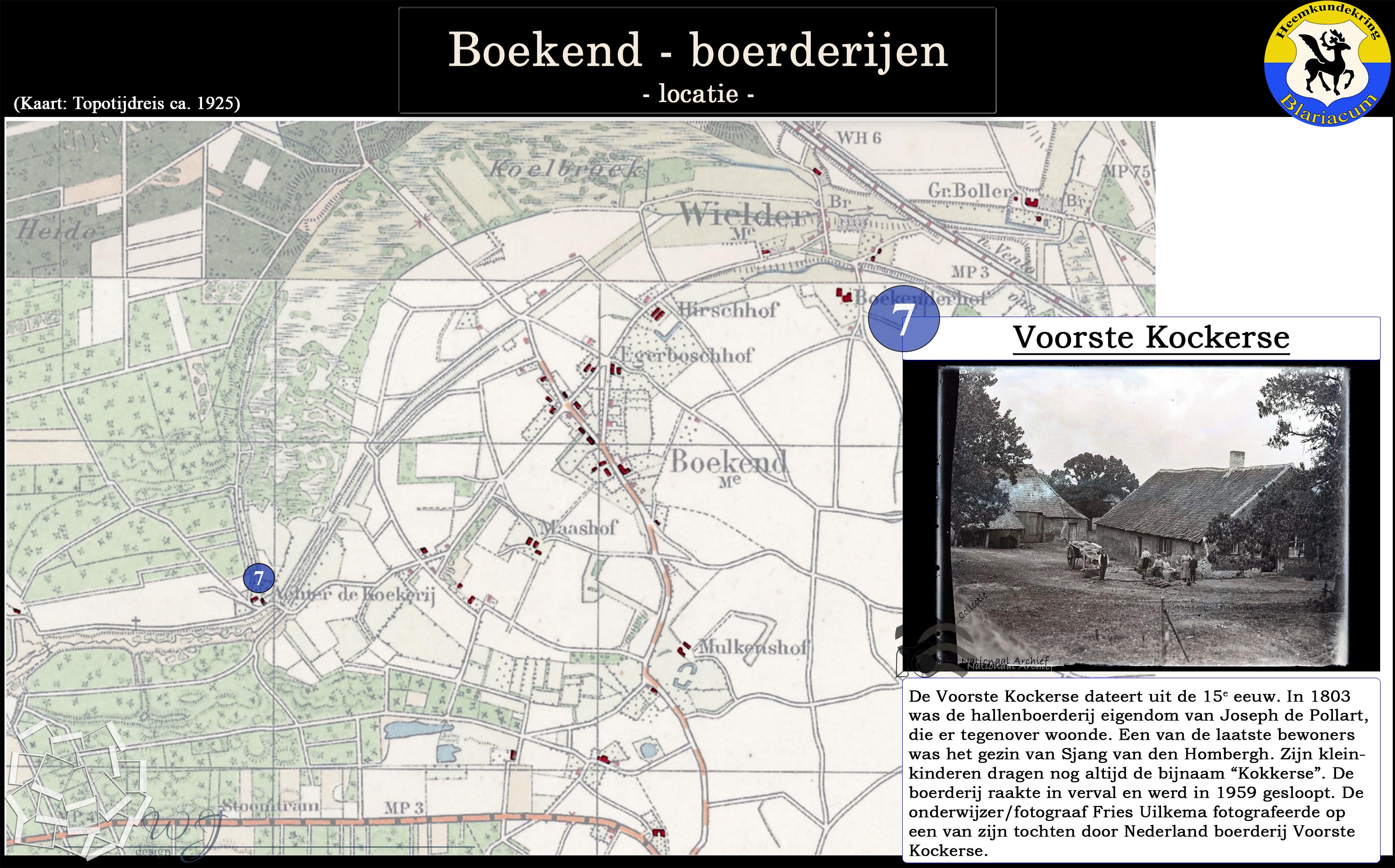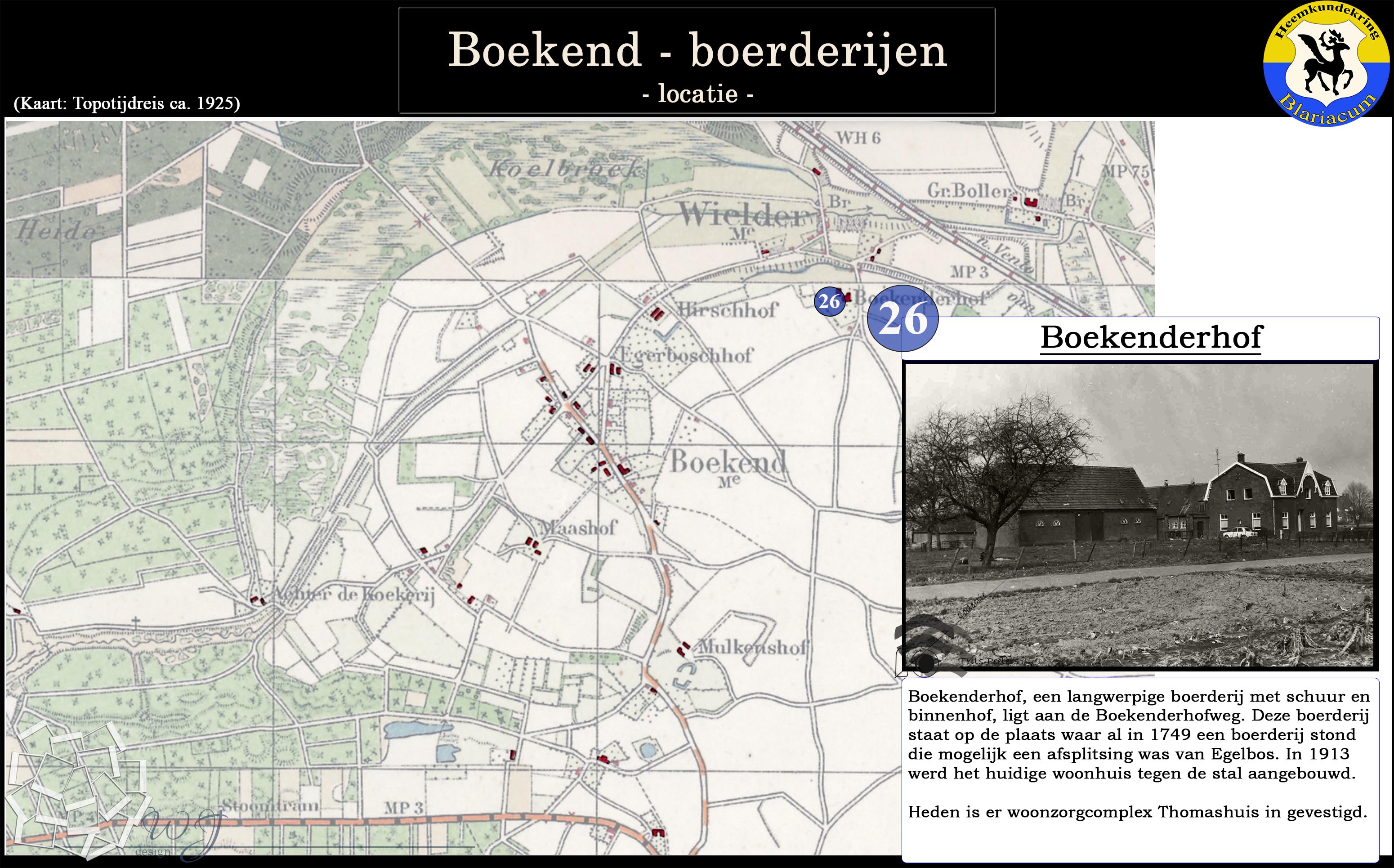 De locatie van de diverse boerderijen in de Boekend in kaart gebracht, tevens is van elke boerderij een korte beschrijving gegeven.