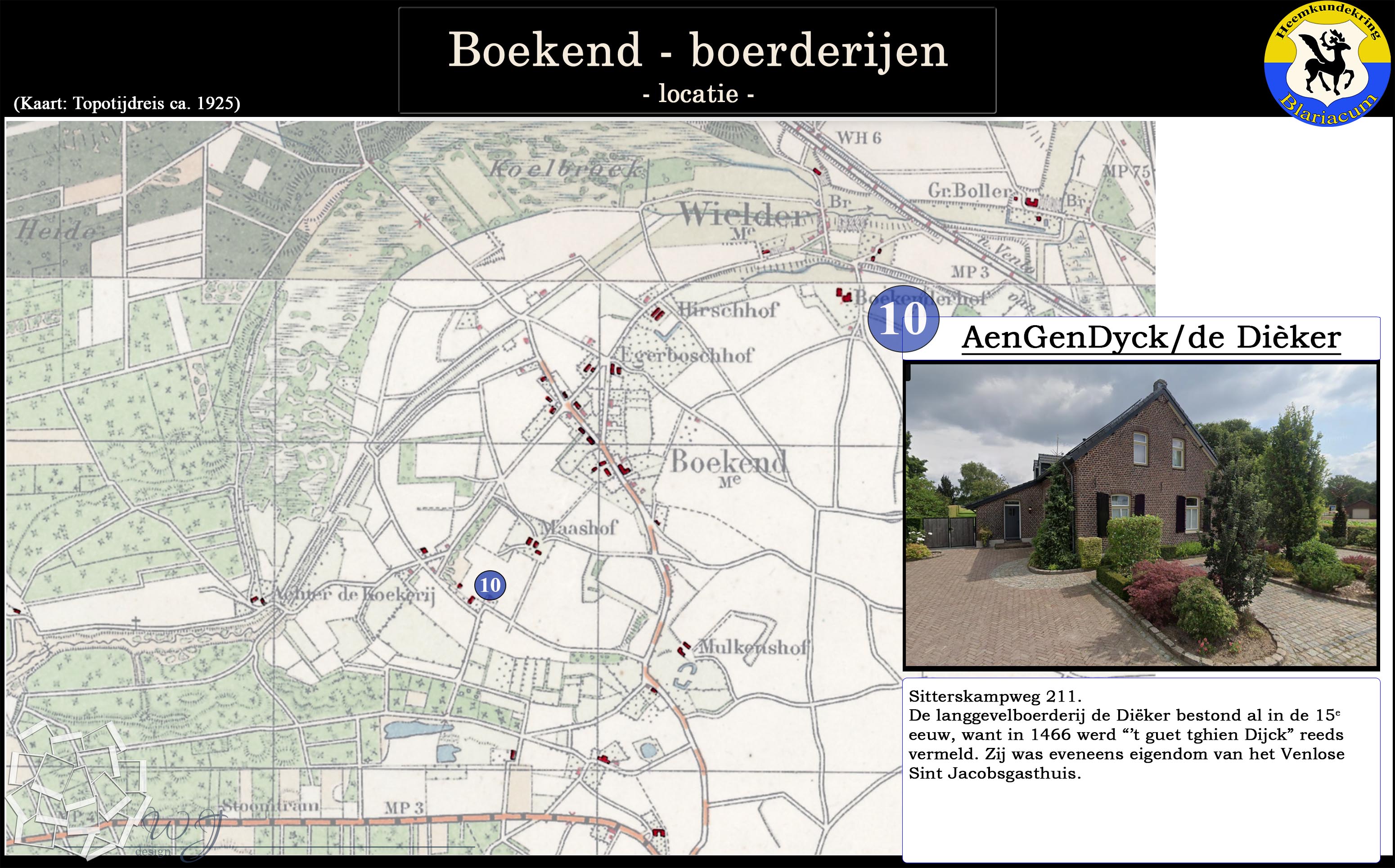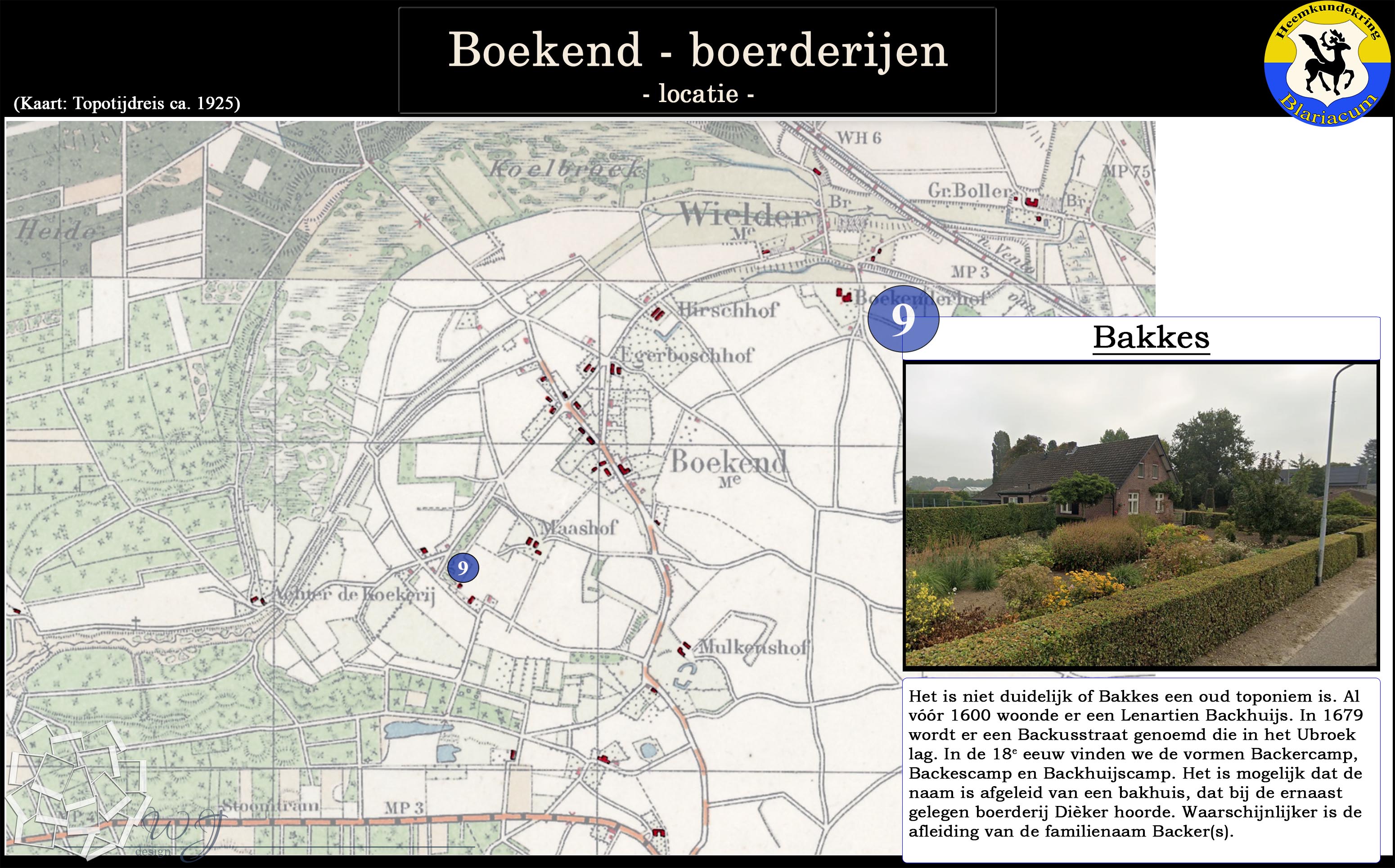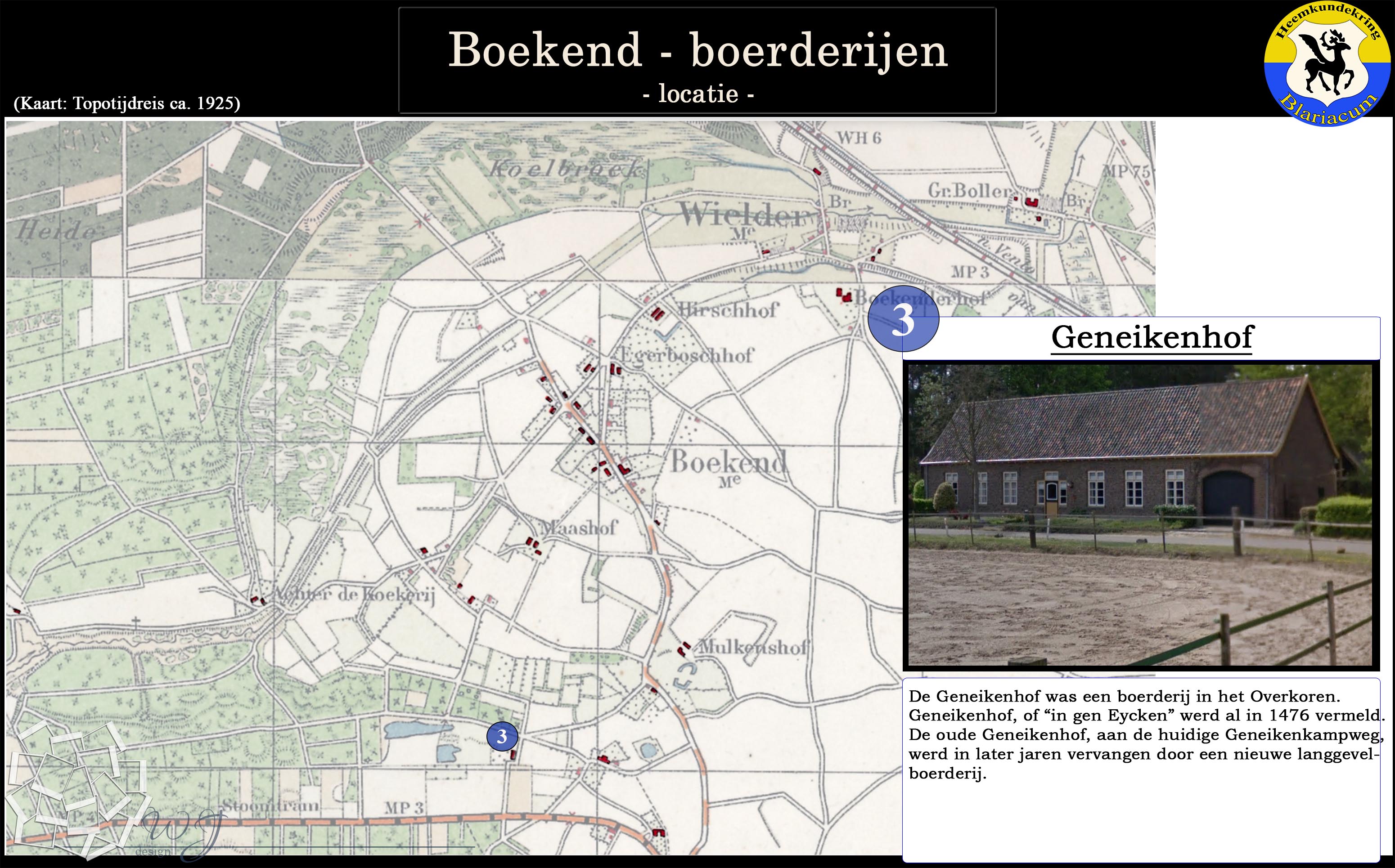 De locatie van de diverse boerderijen in de Boekend in kaart gebracht, tevens is van elke boerderij een korte beschrijving gegeven.