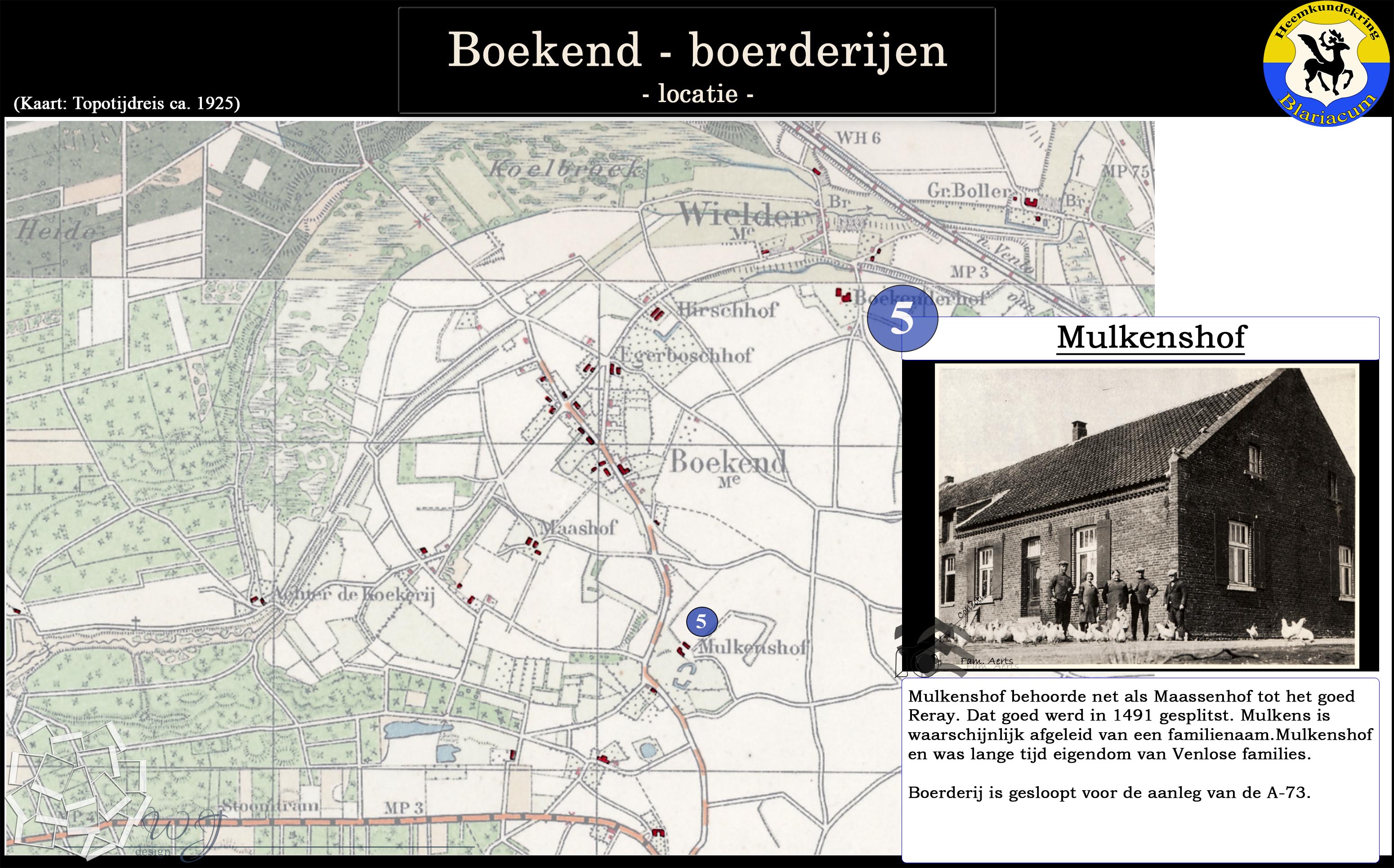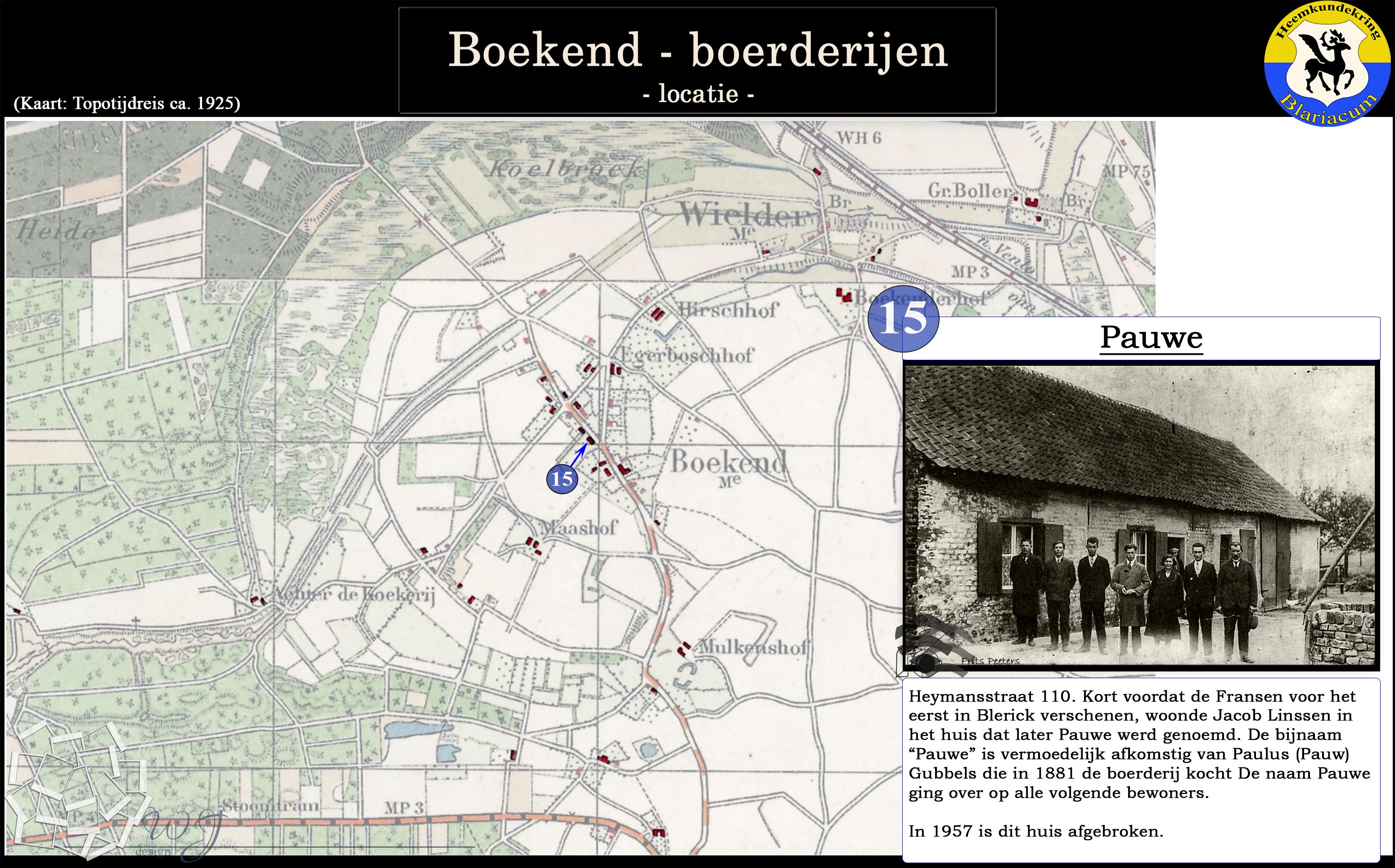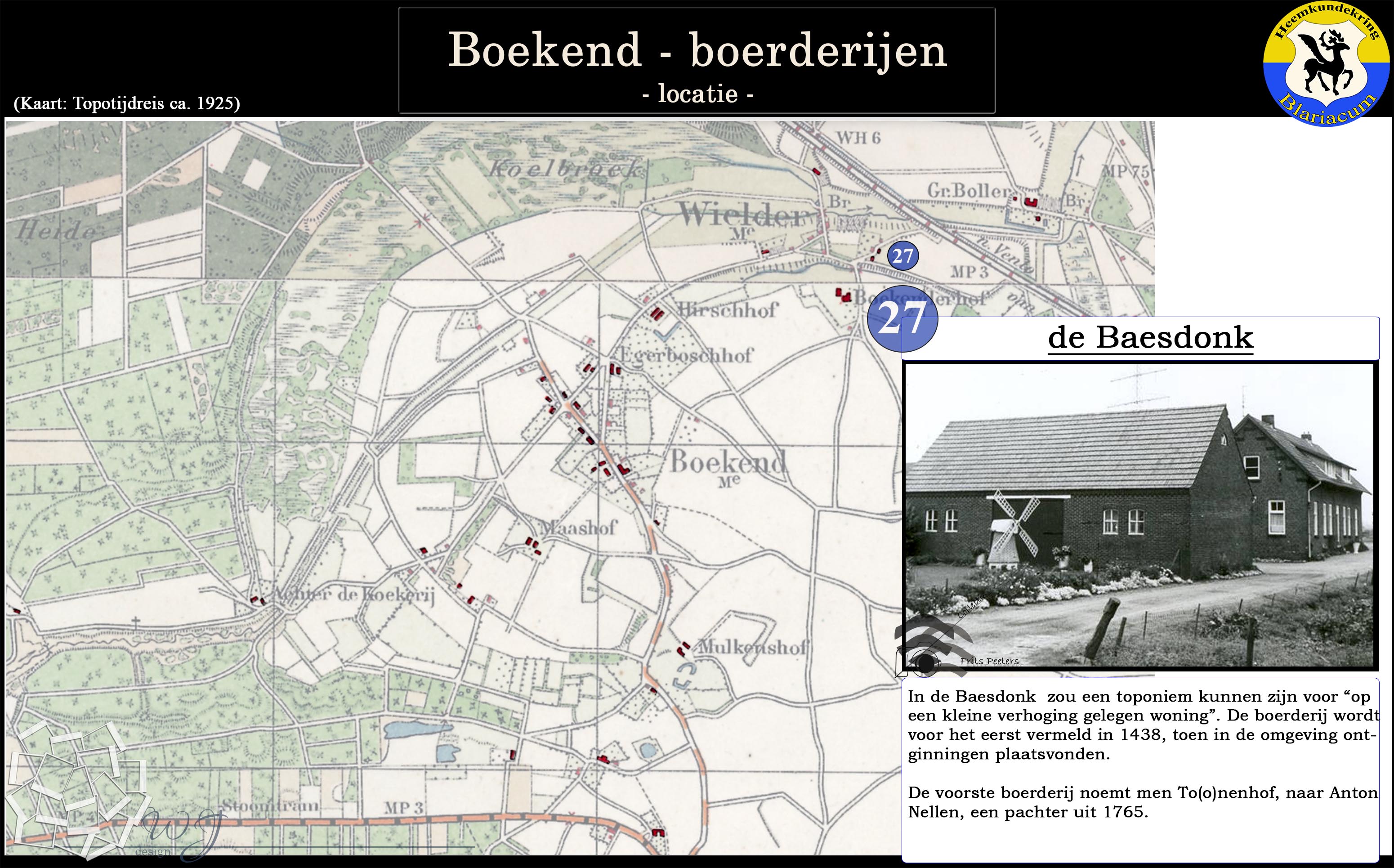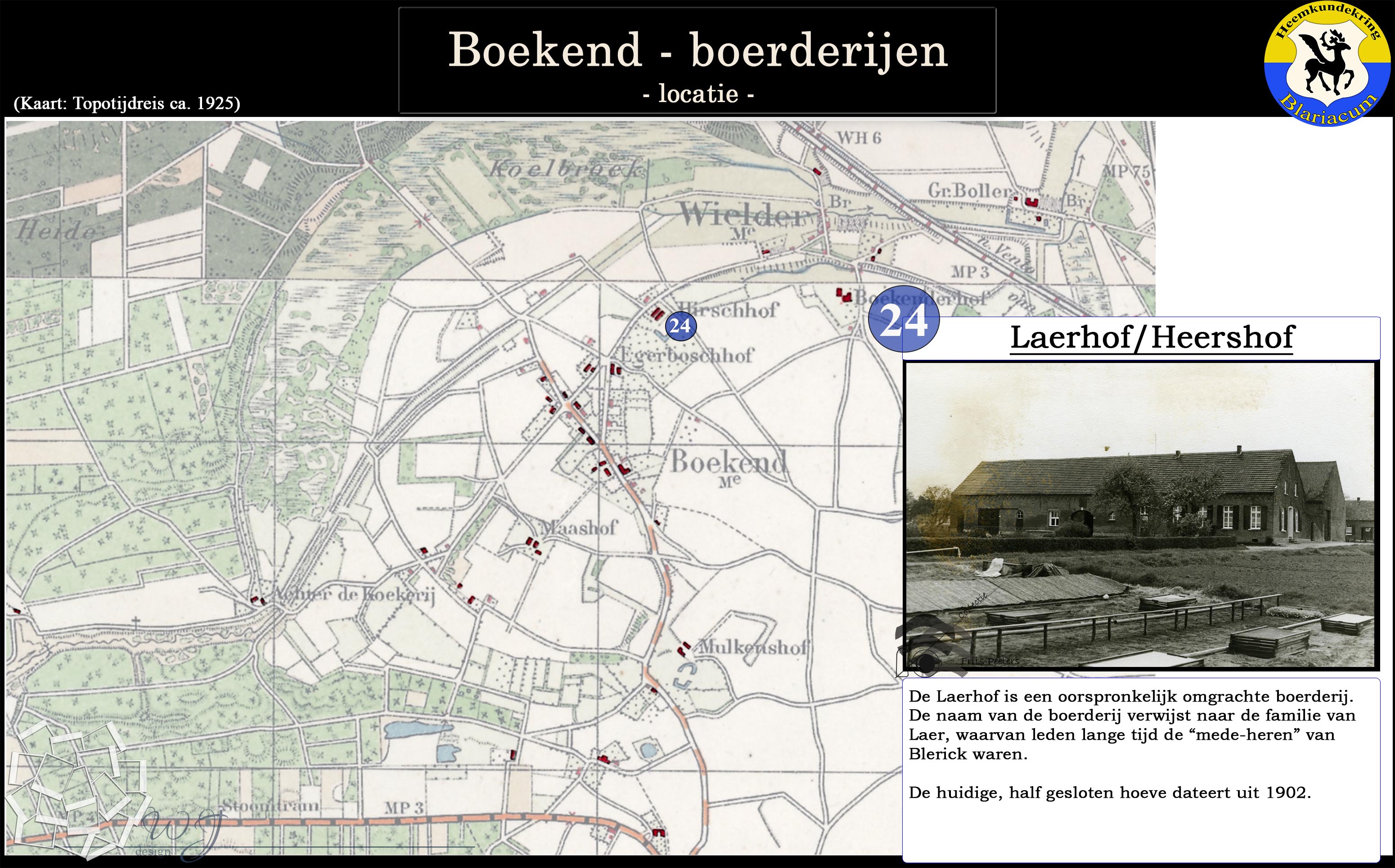 De locatie van de diverse boerderijen in de Boekend in kaart gebracht, tevens is van elke boerderij een korte beschrijving gegeven.