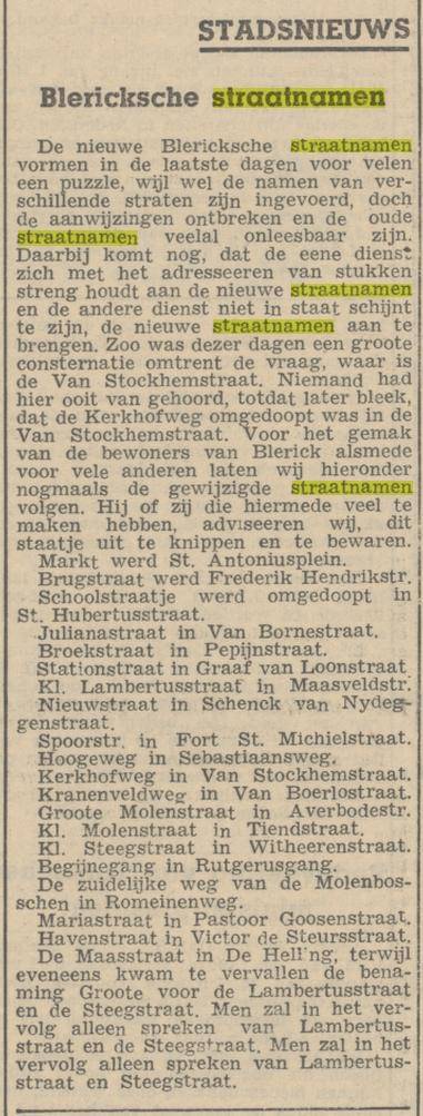 De nieuwe Blericksche straatnamen vormen in de laatste dagen voor velen een puzzle, wijl wel de namen van verschillende straten zijn ingevoerd, doch de aanwijzingen ontbreken en de oude straatnamen veelal onleesbaar zijn. Daarbij komt nog, dat de eene dienst zich met het adresseeren van stukken streng houdt aan de nieuwe straatnamen en de andere dienst niet in staat schijnt te zijn, de nieuwe straatnamen aan te brengen. Zoo was dezer dagen een groote consternatie omtrent de vraag, waar is de Van Stockhemstraat? Niemand had hier ooit van gehoord, totdat later bleek, dat de Kerkhofweg omgedoopt was in de Van Stockhemstraat. Voor het gemak van de bewoners van Blerick alsmede voor vele anderen laten wij hieronder nogmaals de gewijzigde straatnamen volgen. Hij of zij, die hiermede veel te maken hebben, adviseeren wij dit staatje uit te knippen en te bewaren.